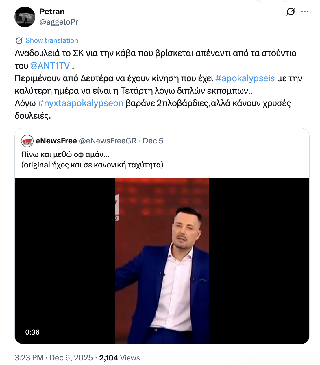 «Αναδουλειά το ΣΚ για την κάβα που βρίσκεται απέναντι από τα στούντιο του @ANT1TV. Περιμένουν από Δευτέρα να έχουν κίνηση που έχει #apokalypseis με την καλύτερη ημέρα να είναι η Τετάρτη λόγω διπλών εκπομπων… Λόγω #nyxtaapokalypseon βαράνε 2πλοβάρδιες,αλλά κάνουν χρυσές δουλειές», έγραψε λογαριασμός του Χ ρίχνοντας ευθείες βολές στον Κουσουλό.