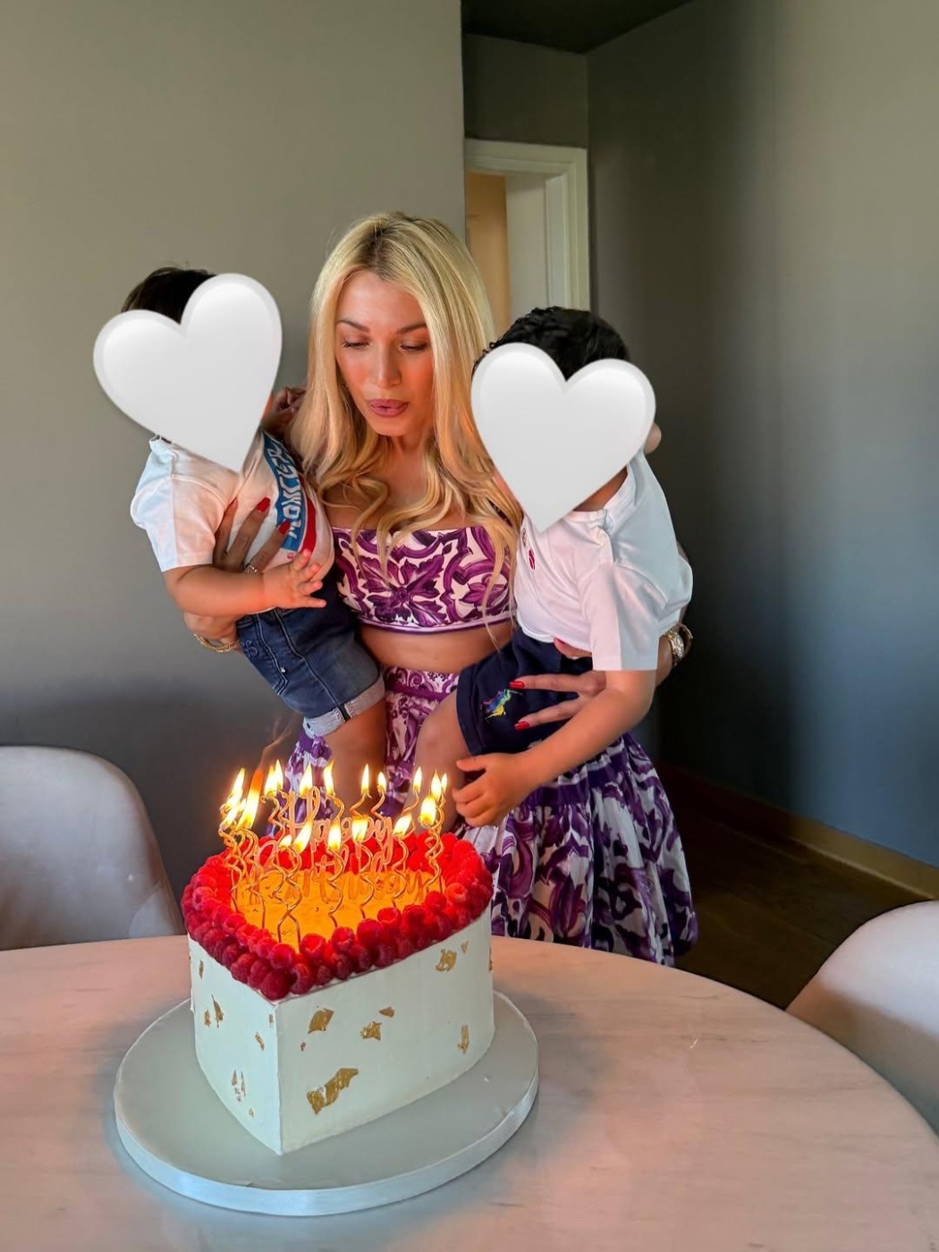 Στη φωτογραφία που έκανε τον γύρο των social media, τη βλέπουμε να σβήνει τα κεράκια της εντυπωσιακής καρδιάς τούρτας, αγκαλιά με τους δύο γιους της.