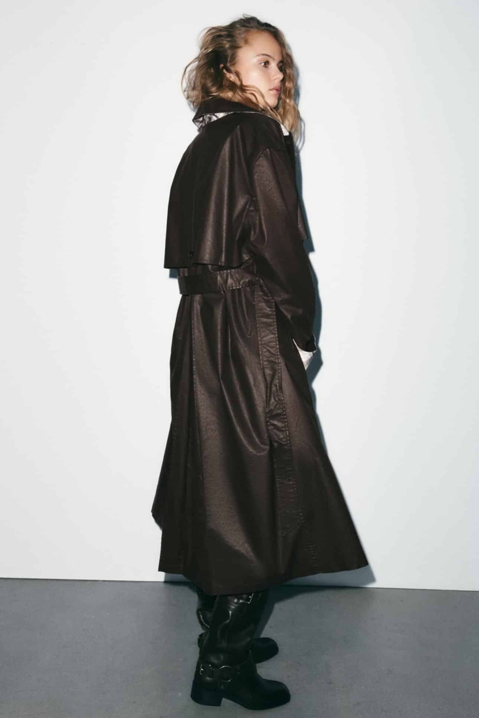Η νέα καμπαρντίνα από τα Zara ξεχωρίζει για την ποιότητά της και τα διακριτικά της στοιχεία. Το σκούρο καφέ χρώμα προσδίδει ζεστασιά και πολυτέλεια, ενώ η λεπτομέρεια με το καρό print στο μανίκι δίνει έναν παιχνιδιάρικο αλλά κομψό τόνο. Η ζώνη στη μέση με μεταλλική αγκράφα επιτρέπει να προσαρμόσεις τη γραμμή, δημιουργώντας είτε μια πιο κλασική είτε μια μοντέρνα, χαλαρή σιλουέτα.