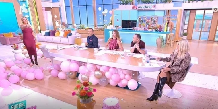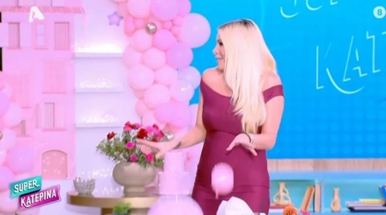 Το πλατό σήμερα ήταν γεμάτο ροζ μπαλόνια ενώ η παρουσιάστρια έκανε είσοδο με το τραγούδι Mamma Mia, φορώντας ένα απίθανο ροζ φόρεμα που αναδείκνυε την φουσκωμένη της κοιλίτσα.
