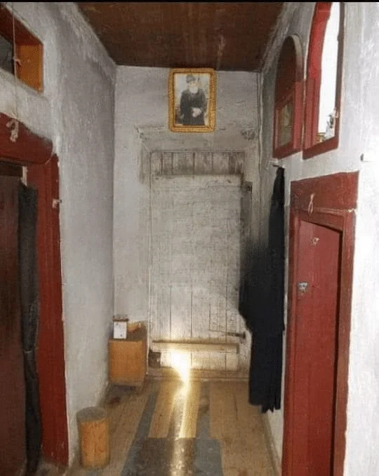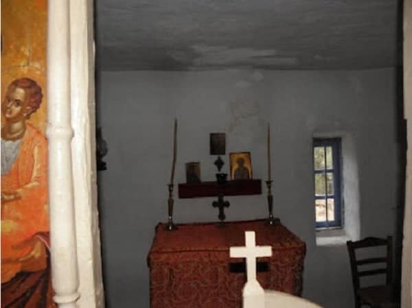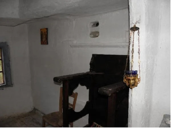 Εντυπωσιακή απλότητα. Λίγα μέτρα δυτικότερα από την είσοδο άλλη εξωτερική πόρτα οδηγούσε στο εργαστήριο του και στο Αρχονταρίκι. ένα μικρό, φτωχό κελλάκι με χαμηλό ταβάνι από καλάμια και χώμα, και με δυο πολύ στενά κρεβάτια, που μεταξύ τους απείχαν ελάχιστα, μόλις χωρούσε να σταθεί ένας άνθρωπος.