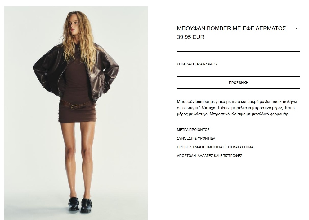 Ανάμεσα στις επιλογές της Zara, ξεχωρίζει το bomber με εφέ δέρματος σε σοκολατί απόχρωση – το απόλυτο χρώμα του φθινοπώρου. Και το καλύτερο; Κυκλοφορεί σε τιμή μόλις 39,95 €, γεγονός που το καθιστά μία από τις πιο value for money προτάσεις της σεζόν. Ένα fashion piece που υπόσχεται να αναβαθμίσει κάθε εμφάνιση χωρίς να ξεφύγει από το budget.
