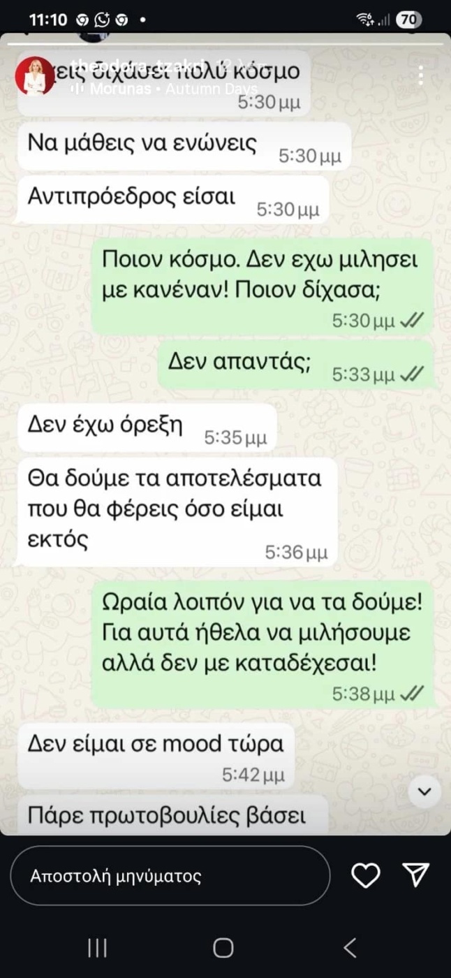 Δίνοντας τη δική της εξήγηση για τη διαρροή του παραπάνω διαλόγου, η κ. Τζάκρη σημείωσε σε ανάρτηση: