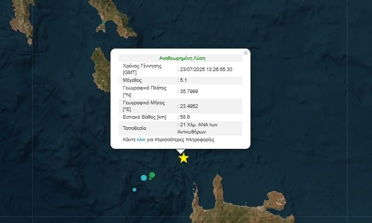 Σεισμός τώρα 5,1 Ρίχτερ στα Αντικύθηρα – Έγινε αισθητός σε Κρήτη, Πελοπόννησο και Αττική