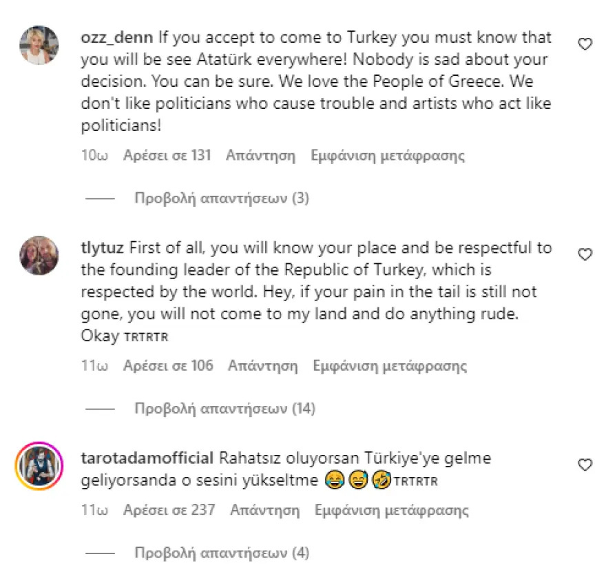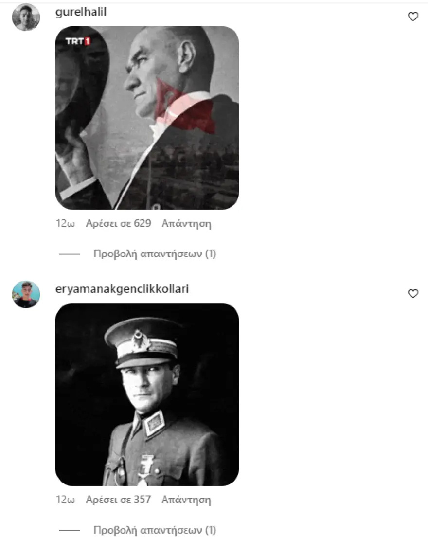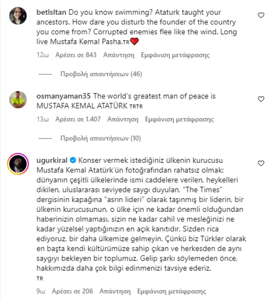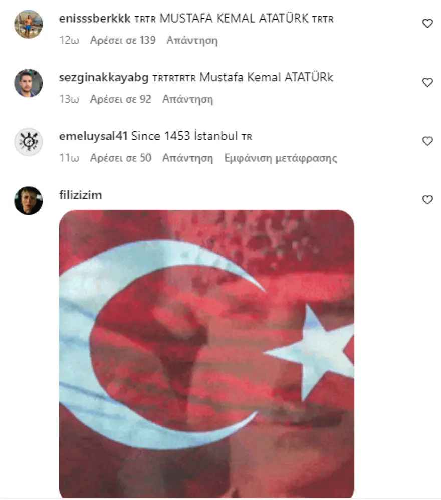 Ο σύντροφος της τραγουδίστριας μπήκε, με τη σειρά του, στο στόχαστρό τους, καθώς σε δικές του δημοσιεύσεις στο Instagram είναι τώρα ορατές τόσο εικόνες του Κεμάλ και της τουρκικής σημαίας, όσο και προσβλητικά μηνύματα.