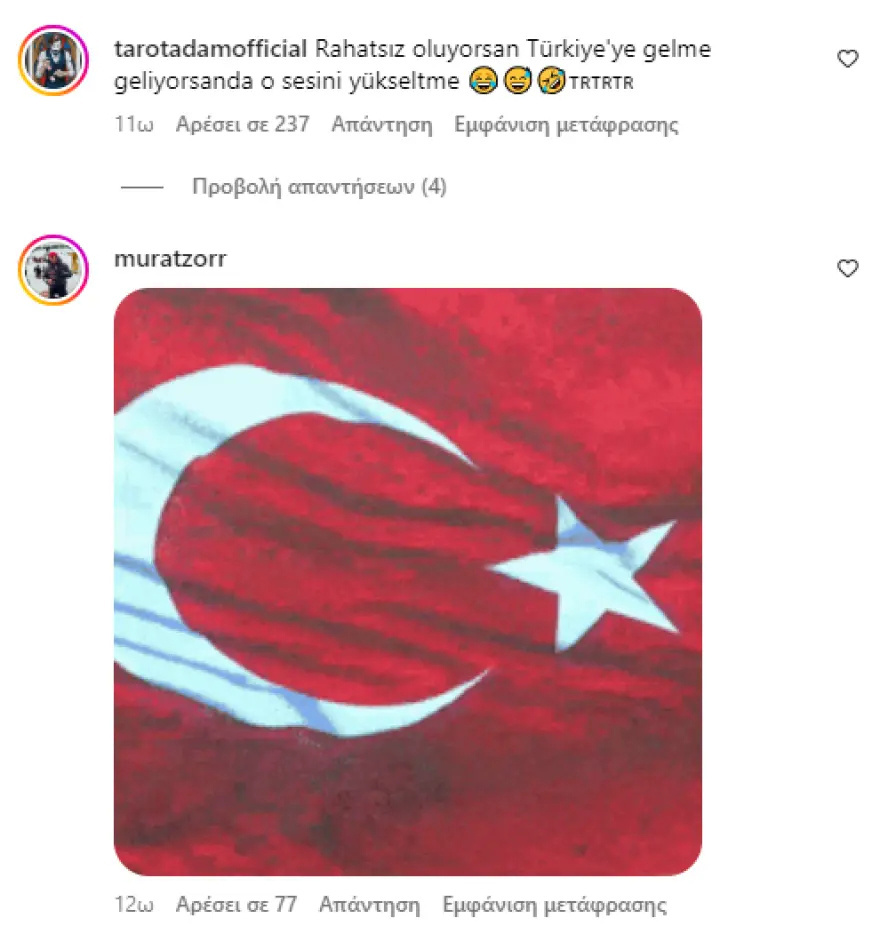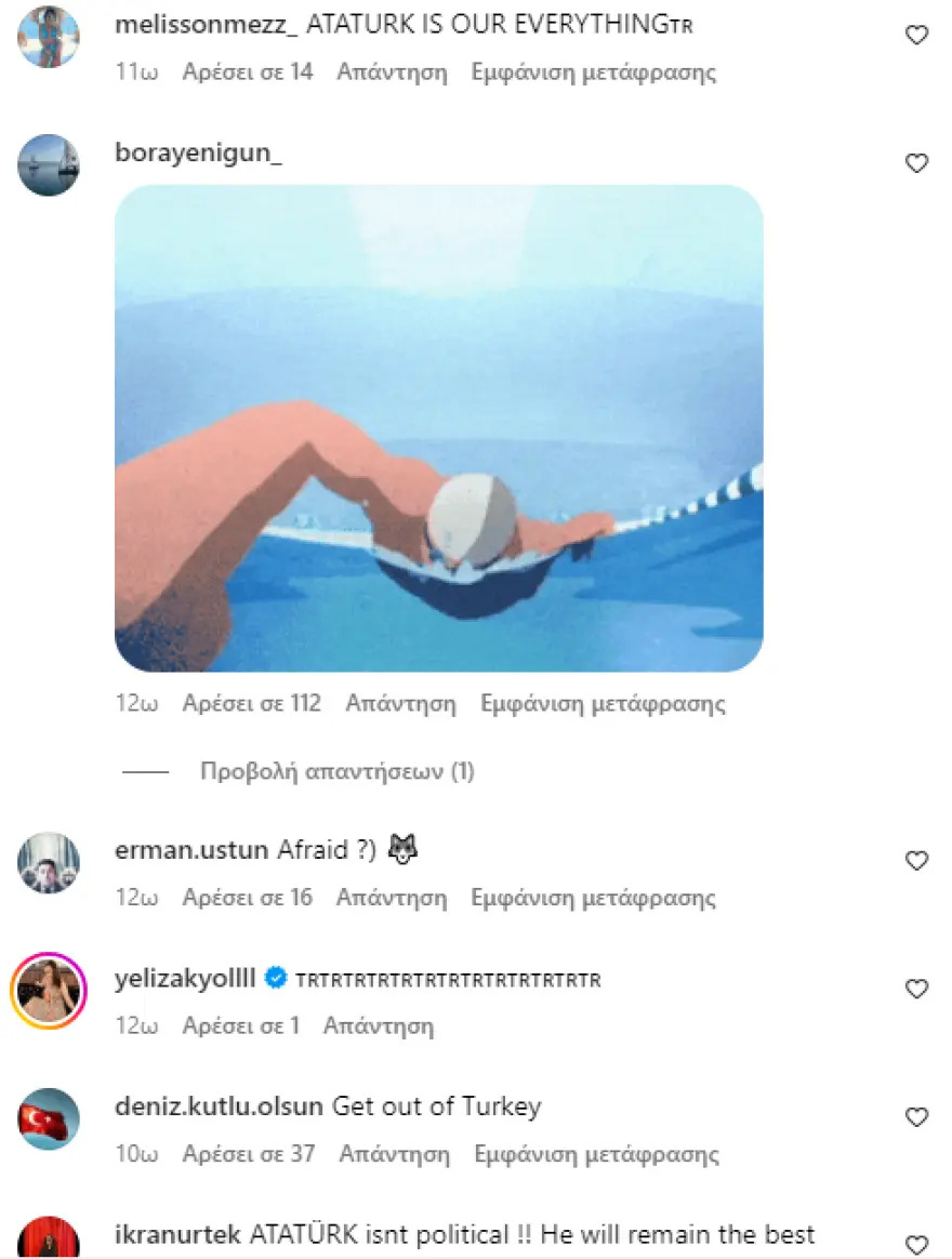 Χαρακτηριστικό ενός από τα δεκάδες σχόλια είναι το εξής: «Σας ευχόμαστε να κολυμπήσετε πίσω στην Ελλάδα όπως έκαναν οι πρόγονοί σας στο παρελθόν και να μην ξαναπατήσετε ποτέ το πόδι σας σε τουρκικό έδαφος». Ενώ, ένα άλλο άτομο σημείωσε: «Θα κολυμπήσετε και πάλι», προσθέτοντας τρία emoji που γελάνε.