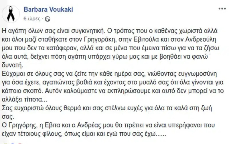 Παρά τον πόνο της, η Βαρβάρα Βουκάκη ανήρτησε στο facebook ένα μεγάλο ευχαριστώ, για όλους τους φίλους της που της συμπαραστάθηκαν.